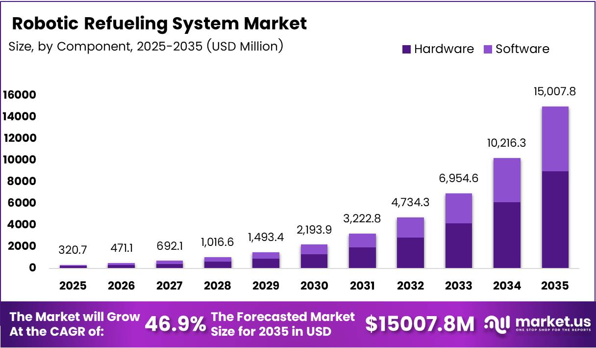 - The Global Robotic Refueling System Market is valued at USD 218.3 Million in 2025 and is forecast to reach USD 15,007.8 Million by 2035 at a CAGR of 46.90%.
