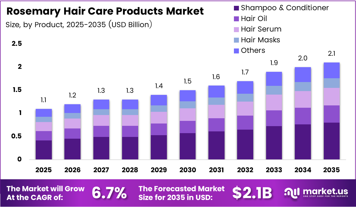 Global Rosemary Hair Care Products Market size is expected to be worth around USD 2.1 Billion by 2035 from USD 1.1 Billion in 2025, growing at a CAGR of 6.7% during the forecast period 2026 to 2035.