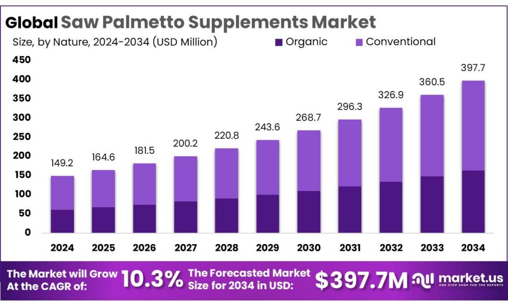 - Saw Palmetto Supplements Market size is expected to be worth around USD 397.7 Million by 2034, from USD 149.2 Million in 2024, growing at a CAGR of 10.3%.
