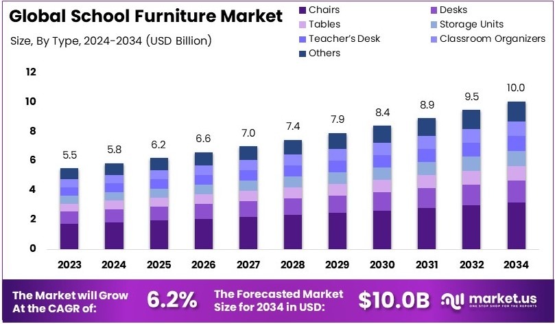 The Global School Furniture Market size is expected to be worth around USD 10.0 Billion by 2034, from USD 5.5 Billion in 2024, growing at a CAGR of 6.2% during the forecast period from 2025 to 2034.