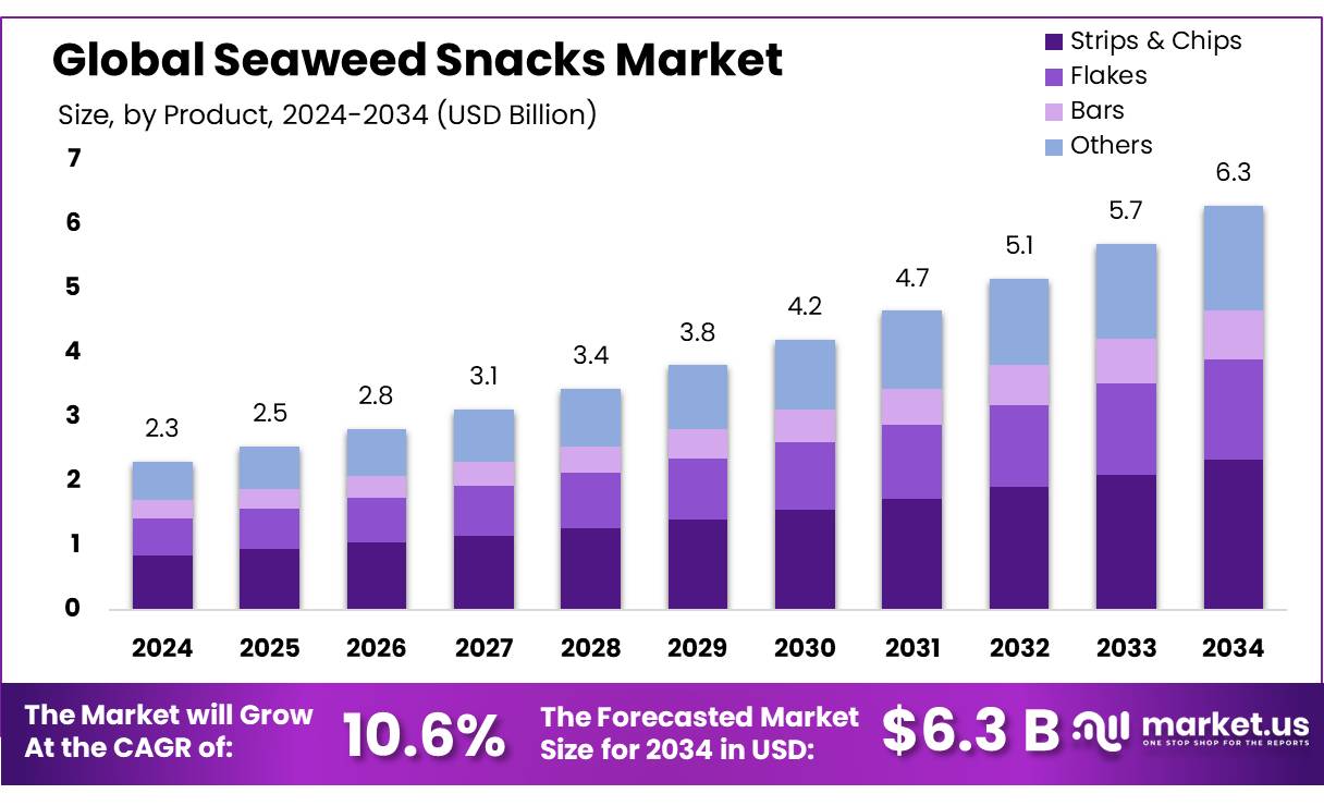 The Global Seaweed Snacks Market size is expected to be worth around USD 6.3 Bn by 2034, from USD 2.3 Bn in 2024, growing at a CAGR of 10.6% during the forecast period from 2025 to 2034.