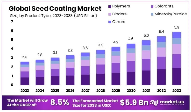 - The Seed Coating Market was valued at 2.6 Billion in 2023 and is expected to reach 5.9 Billion by 2033, with a CAGR of 8.5%.