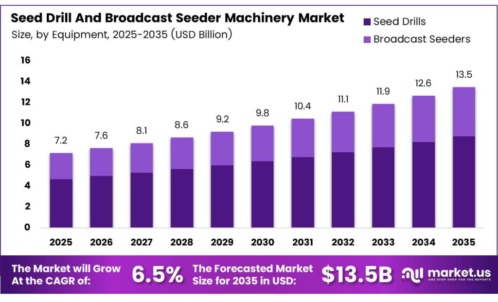 The Global Seed Drill and Broadcast Seeder Machinery Market size is expected to be worth around USD 13.5 billion by 2035 from USD 7.2 billion in 2025, growing at a CAGR of 6.5% during the forecast period 2026 to 2035.