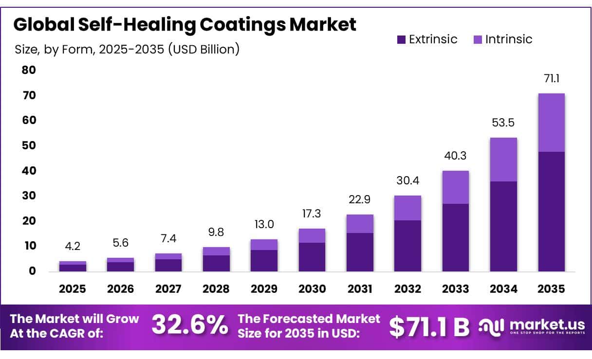- Self-Healing Coatings Market size is expected to be worth around USD 71.1 Billion by 2035, from USD 4.2 Billion in 2025, growing at a CAGR of 32.6%.