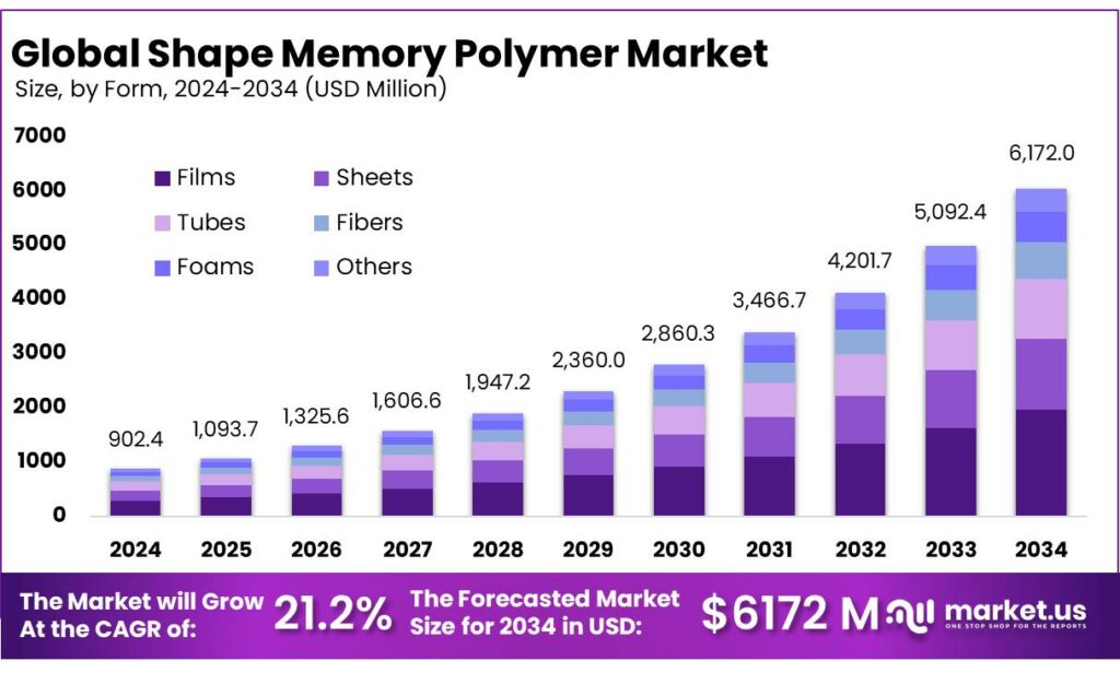 - Shape Memory Polymer Market is expected to be worth around USD 6172.0 Million by 2034, up from USD 902.4 Million in 2024, and is projected to grow at a CAGR of 21.2%.