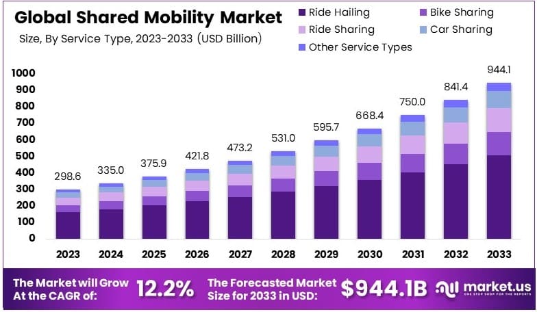 The Global Shared Mobility Market size is expected to be worth around USD 944.1 Billion by 2033, from USD 298.6 Billion in 2023, growing at a CAGR of 12.2% during the forecast period from 2024 to 2033.