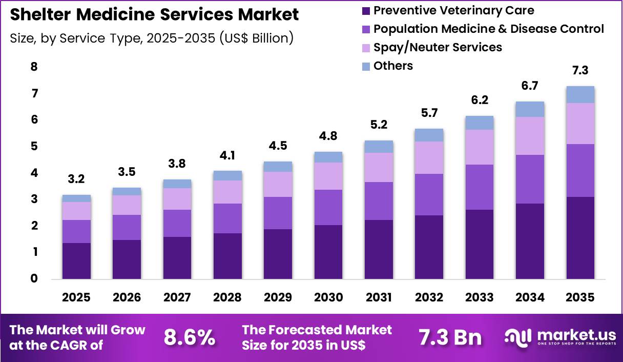 Preventive veterinary care accounted for 42.6% of growth within service type and dominate the shelter medicine services market due to the strong emphasis on disease prevention and early treatment in high-density animal environments.