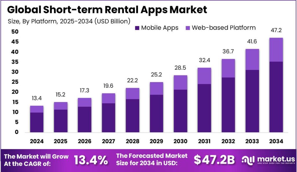 - The Global Short-term Rental Apps Market is expected to reach USD 47.2 Billion by 2034, growing from USD 13.42 Billion in 2024, with a CAGR of 13.40% during the forecast period from 2025 to 2034.
