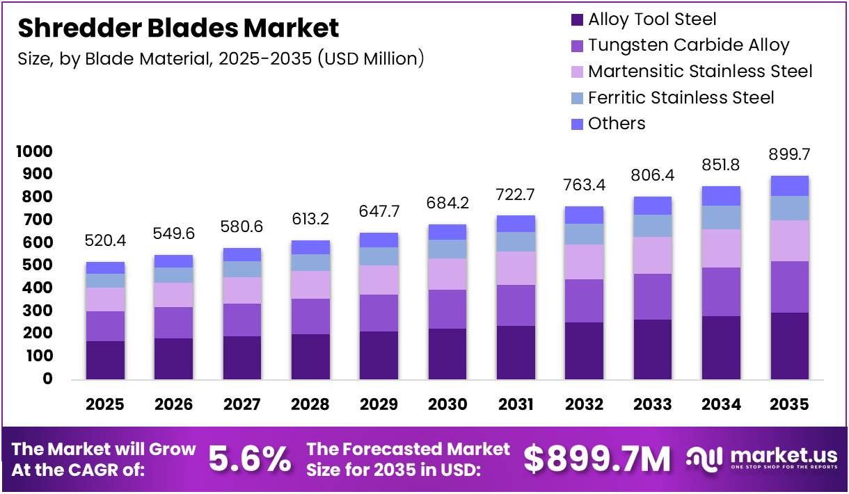 The Global Shredder Blades Market size is expected to be worth around USD 899.7 Million by 2035 from USD 520.4 Million in 2025, growing at a CAGR of 5.6% during the forecast period 2026 to 2035.