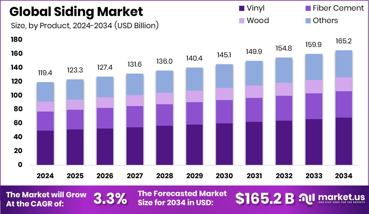 - Global Siding Market is expected to be worth around USD 165.2 billion by 2034, up from USD 119.4 billion in 2024, and grow at a CAGR of 3.3% from 2025 to 2034.