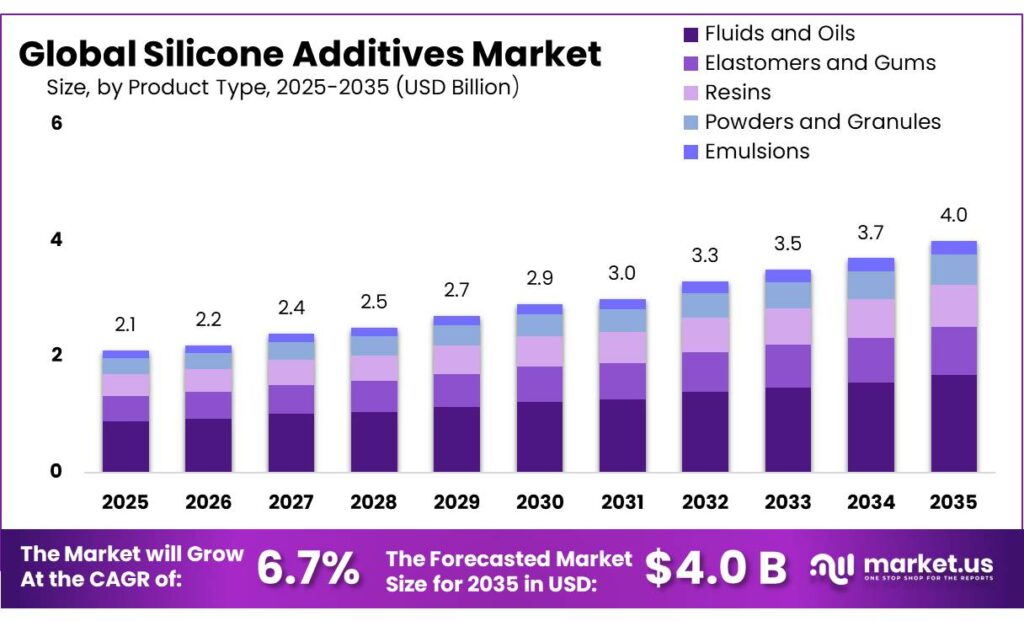 - Silicone Additives Market size is expected to be worth around USD 4.0 Billion by 2035, from USD 2.1 Billion in 2025, growing at a CAGR of 6.7%.