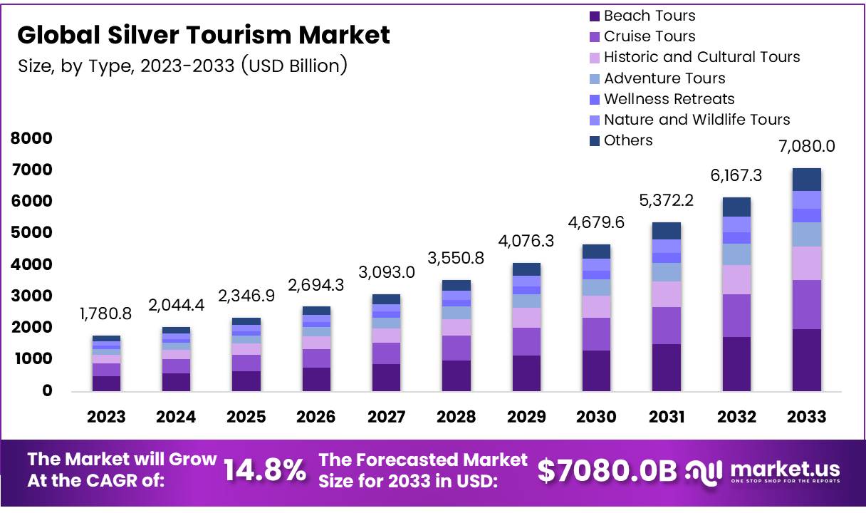 - The Global Silver Tourism Market is projected to grow from USD 1,780.8 Billion in 2023 to USD 7080.0 Billion by 2033, with a CAGR of 14.8%.