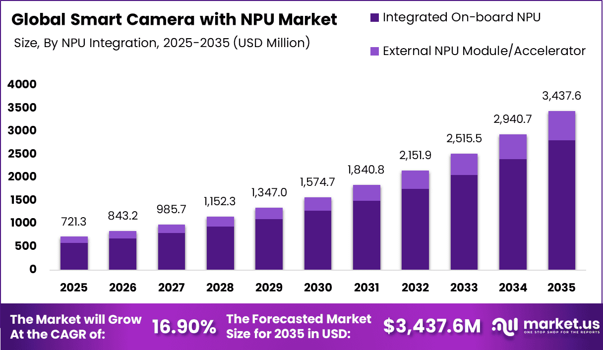 The Global Smart Camera with NPU Market generated USD 721.3 million in 2025 and is predicted to register growth from USD 843.2 million in 2026 to about USD 3,437.6 million by 2035, recording a CAGR of 16.90% throughout the forecast span. In 2025, North America held a dominan market position, capturing more than a 36.1% share, holding USD 260.38 Million revenue.