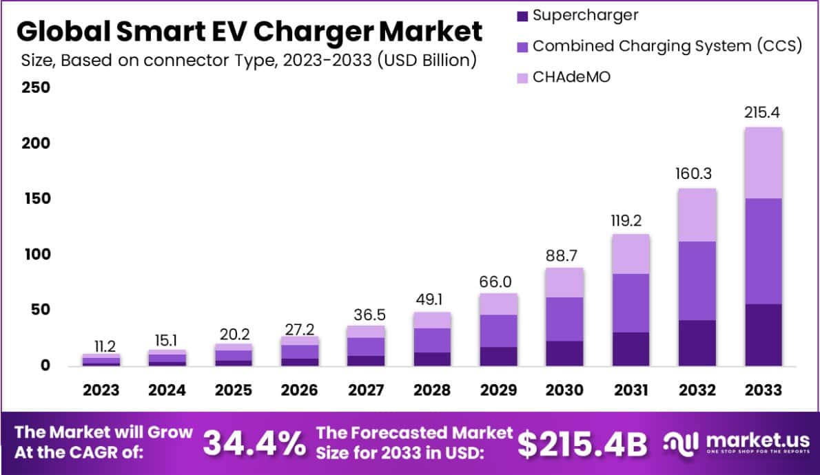 - The Global Smart EV Charger Market is expected to be worth around USD 215.4 billion by 2033, up from USD 11.2 billion in 2023, growing at a CAGR of 34.4% during the forecast period from 2024 to 2033.