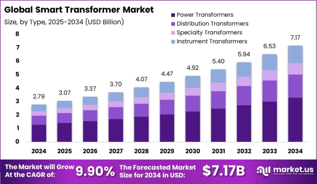 - The Global Smart Transformer Market size is projected to reach USD 7.17 Billion by 2034, growing from USD 2.79 Billion in 2024. The market is expected to expand at a CAGR of 9.90% from 2025 to 2034.