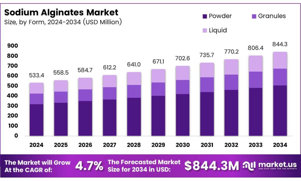 - The Global Sodium Alginates Market grows from USD 533.4 million in 2024 to USD 844.3 million by 2034 at 4.7% CAGR.
