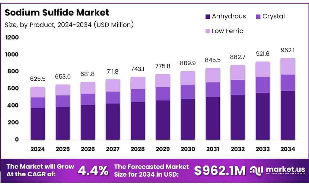 The Global Sodium Sulfide Market size is expected to be worth around USD 962.1 million by 2034 from USD 625.5 million in 2024, growing at a CAGR of 4.4% during the forecast period 2025 to 2034.