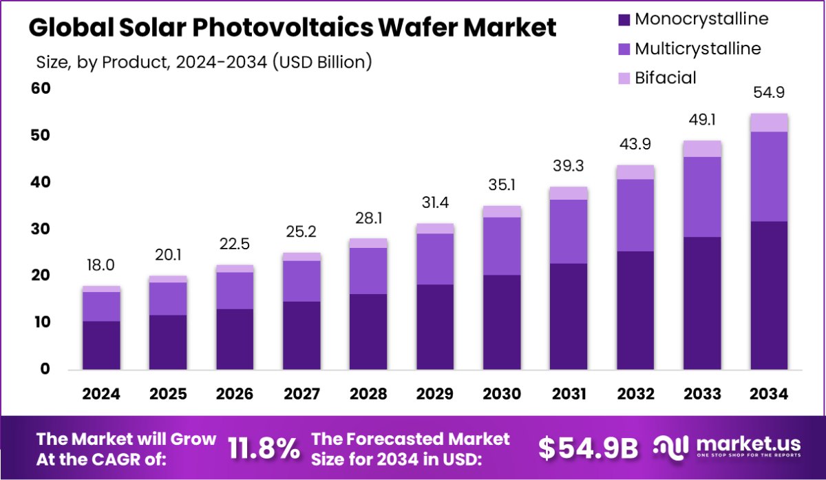 - Global Solar Photovoltaics Wafer Market is expected to be worth around USD 54.9 billion by 2034, up from USD 18.0 billion in 2024, and grow at a CAGR of 11.8% from 2025 to 2034.