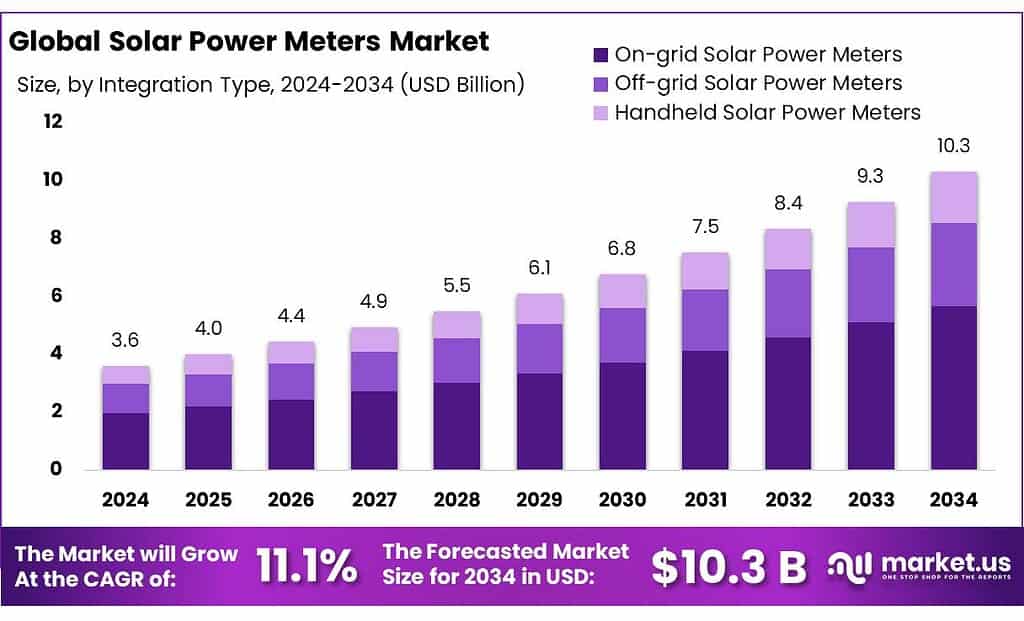 - Solar Power Meters Market size is expected to be worth around USD 10.3 Billion by 2034, from USD 3.6 Billion in 2024, growing at a CAGR of 11.1%.