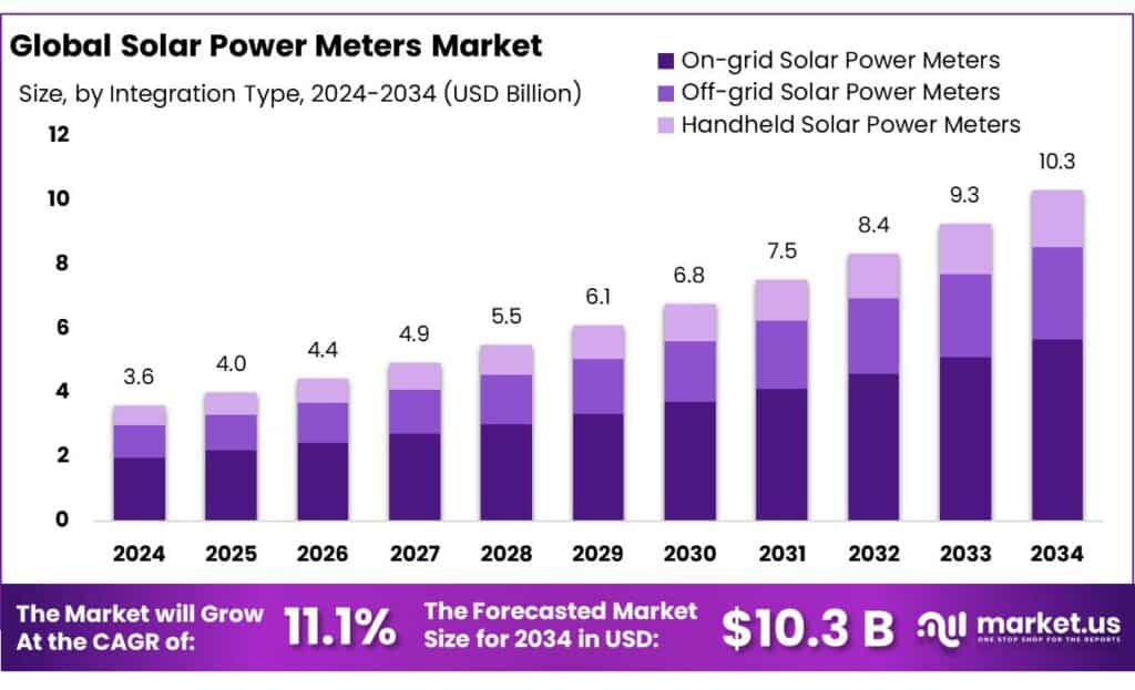 - Solar Power Meters Market size is expected to be worth around USD 10.3 Billion by 2034, from USD 3.6 Billion in 2024, growing at a CAGR of 11.1%.
