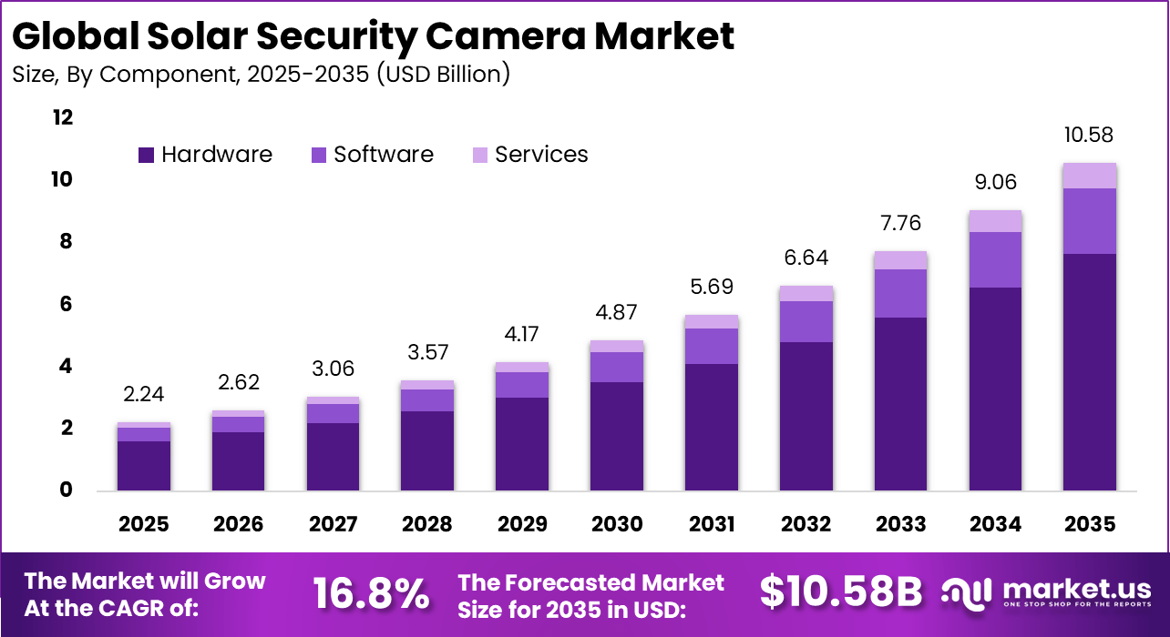 Global Solar Security Camera Market Size, Share and Analysis Report Analysis By Component (Hardware, Software, Services), By Product Type (Fixed Solar Security Cameras, PTZ (Pan-Tilt-Zoom) Solar Security Cameras), By Resolution (1080p Full HD, 2K / 4K Ultra HD), By Application (Residential Security, Commercial & Industrial Security, Public Infrastructure & Remote Monitoring, Agricultural & Wildlife Monitoring), By Sales Channel (Online Retail, Offline Retail (Security & Electronics Stores), Direct Sales from Manufacturer), By Regional Analysis, Global Trends and Opportunity, Future Outlook By 2025-2035