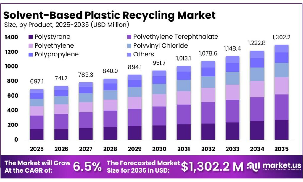 - Solvent-Based Plastic Recycling Market size is expected to be worth around USD 1,302.2 Million by 2035, from USD 697.1 Million in 2025, growing at a CAGR of 6.5%.