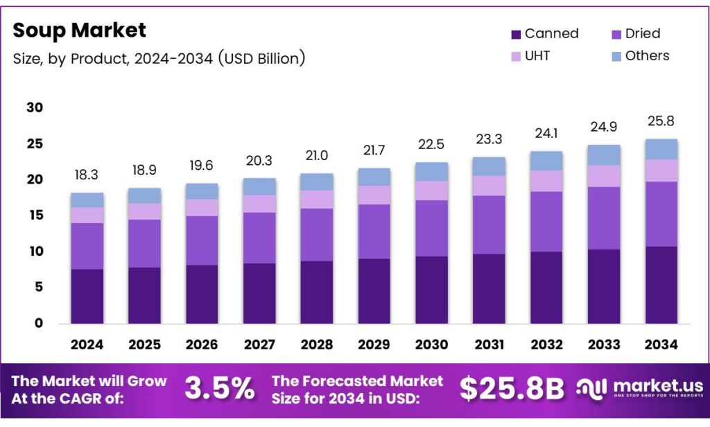 - The Global Soup Market reached USD 18.3 billion in 2024 and is projected to hit USD 25.8 billion by 2034, at a steady CAGR of 3.5% from 2025 to 2034.