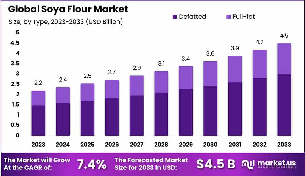 - The Global Soya Flour Market size is expected to be worth around USD 4.5 Billion by 2033, from USD 2.2 Billion in 2023, growing at a CAGR of 7.4% during the forecast period from 2024 to 2033.