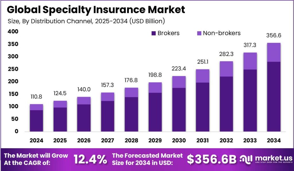 Global Specialty Insurance Market Size, Share, Statistics Analysis Report By Type (Political Risk and Credit Insurance, Entertainment Insurance, Art Insurance, Livestock and Aquaculture Insurance, Marine, Aviation and Transport (MAT) Insurance, Others), By Distribution Channel (Brokers, Non-brokers), By End User (Business, Individuals), Region and Companies - Industry Segment Outlook, Market Assessment, Competition Scenario, Trends and Forecast 2025-2034