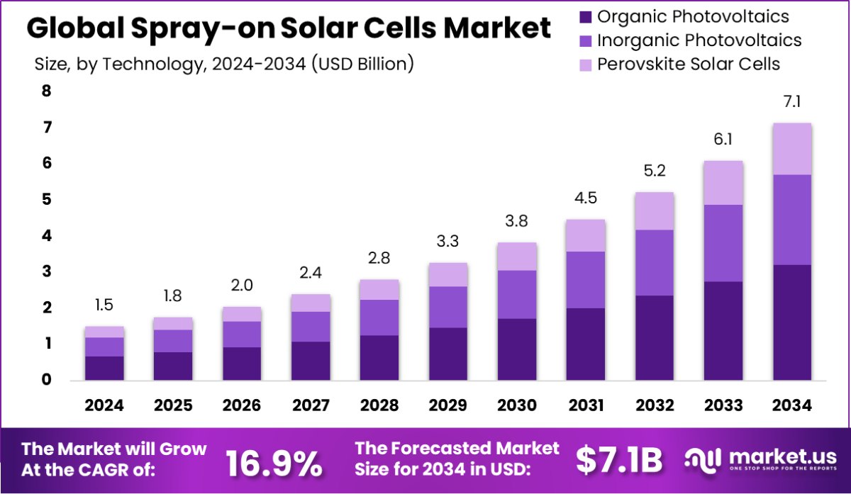 - Global Spray-on Solar Cells Market is expected to be worth around USD 7.1 Billion by 2034, up from USD 1.5 Billion in 2024, and grow at a CAGR of 16.9% from 2025 to 2034.