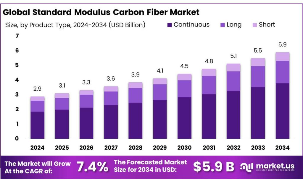 Global Standard Modulus Carbon Fiber Market Size, Share, And Industry Analysis Report By Product Type (Continuous, Long, Short), By Application (Composites, Non-composites), By End-use (Aerospace And Defense, Wind Energy, Automotive, Sporting Goods, Construction, Pipes And Tanks, Others) , By Region and Companies - Industry Segment Outlook, Market Assessment, Competition Scenario, Trends and Forecast 2025-2034