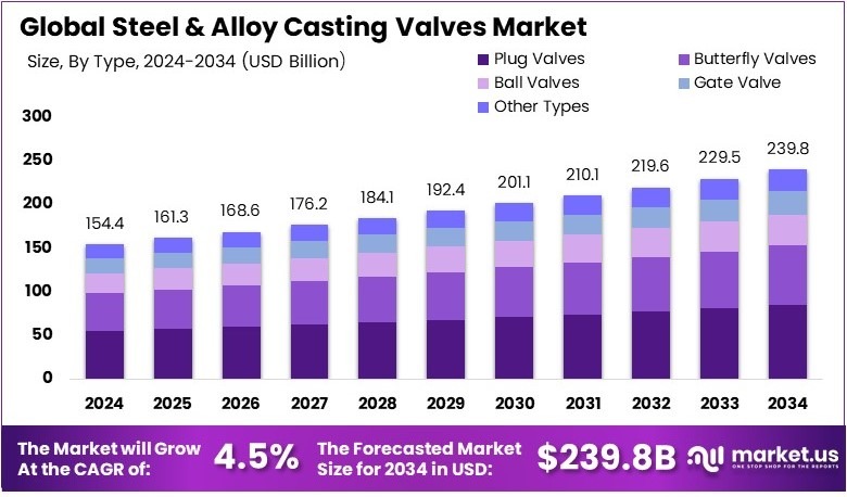The Global Steel and Alloy Casting Valves Market size is expected to be worth around USD 239.8 Billion by 2034, from USD 154.4 Billion in 2024, growing at a CAGR of 4.5% during the forecast period from 2025 to 2034.