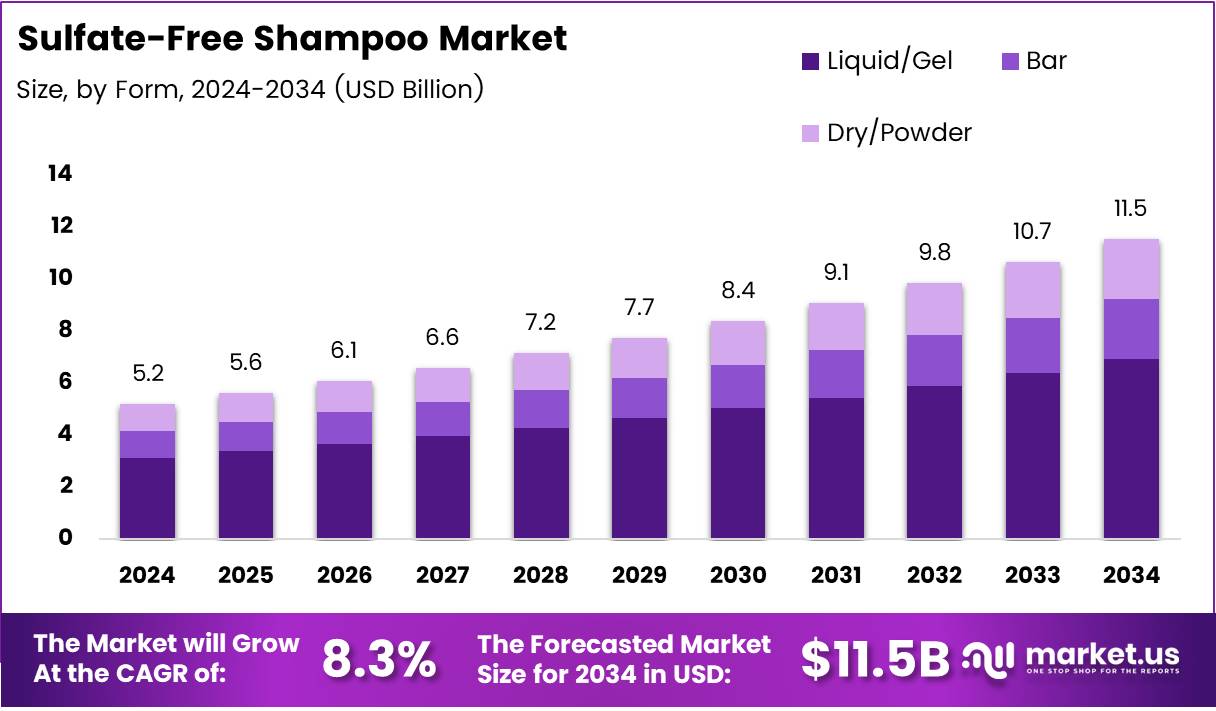 - The Global Sulfate-Free Shampoo Market is projected to reach USD 11.5 Billion by 2034 from USD 5.2 Billion in 2024, growing at a CAGR of 8.3%.
