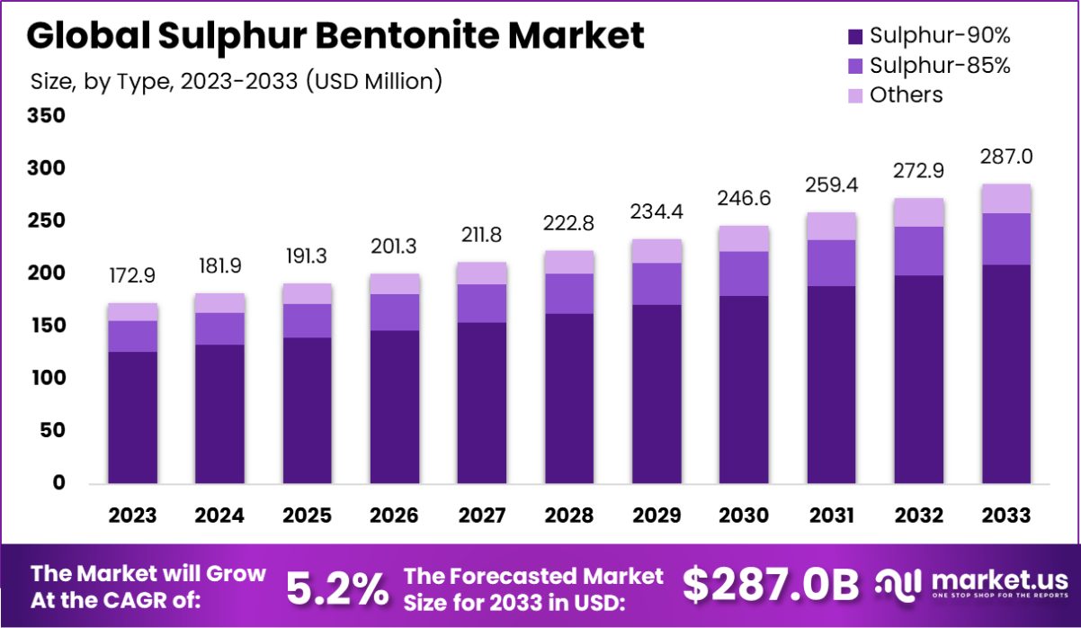 - The Global Sulphur Bentonite Market is expected to be worth around USD 287.0 Million by 2033, up from USD 172.9 Million in 2023, and grow at a CAGR of 5.2% from 2024 to 2033.