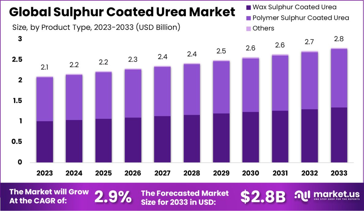 - The Global Sulphur Coated Urea Market is expected to be worth around USD 2.8 Billion by 2033, up from USD 2.1 Billion in 2023, and grow at a CAGR of 2.9% from 2024 to 2033.