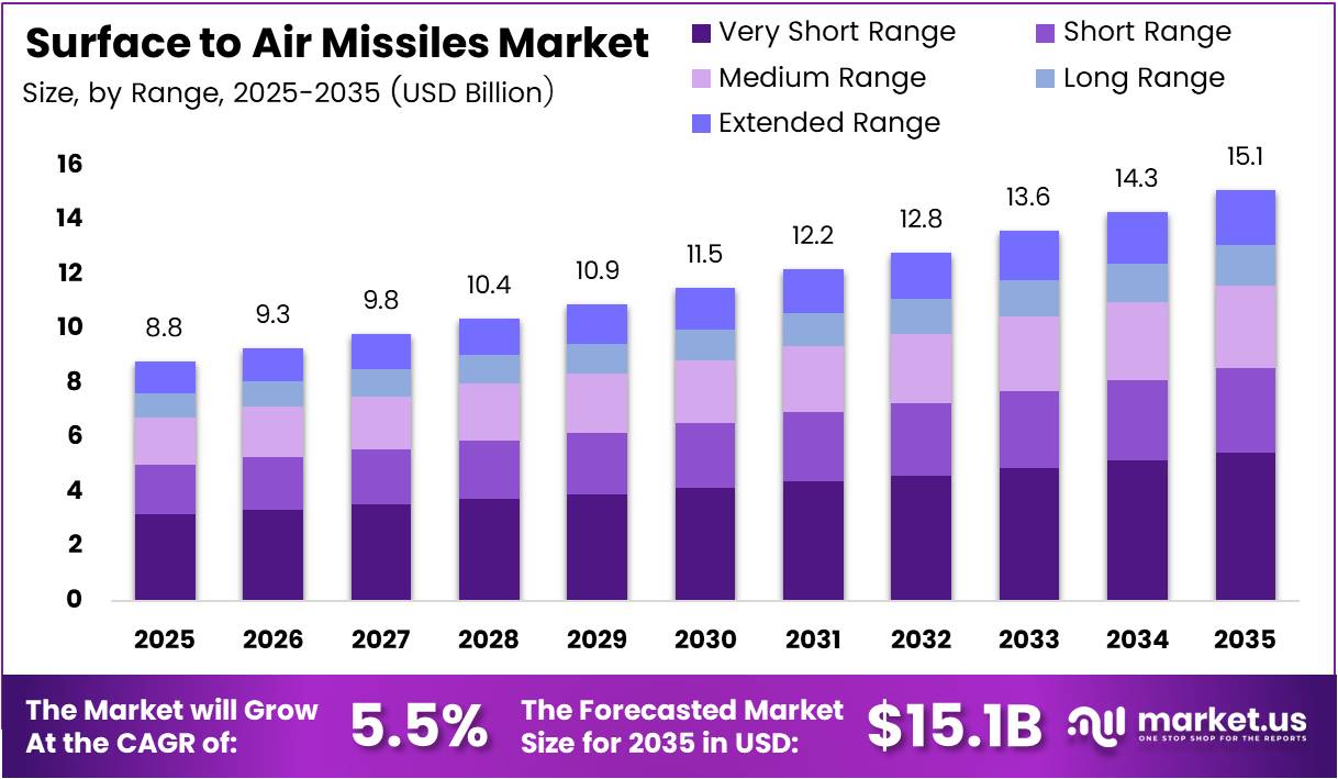 Global Surface to Air Missiles Market size is expected to be worth around USD 15.1 Billion by 2035 from USD 8.8 Billion in 2025, growing at a CAGR of 5.5% during the forecast period 2026 to 2035.