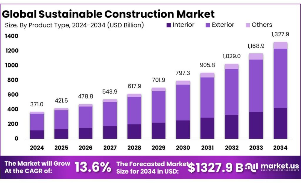 - Sustainable Construction Market is expected to be worth around USD 1327.9 Billion by 2034, up from USD 371. Billion in 2024, and is projected to grow at a CAGR of 13.6%.