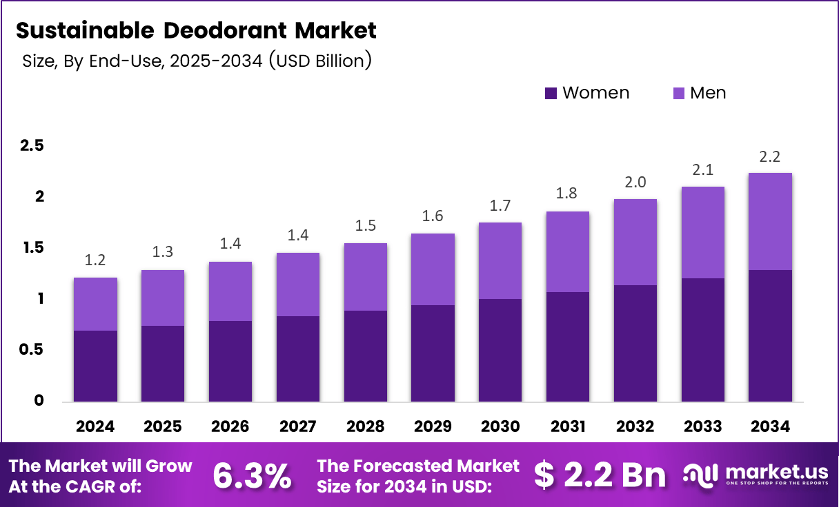 - The global Sustainable Deodorant Market is projected to reach USD 2.2 billion by 2034, expanding from USD 1.2 billion in 2024 at a CAGR of 6.3%.