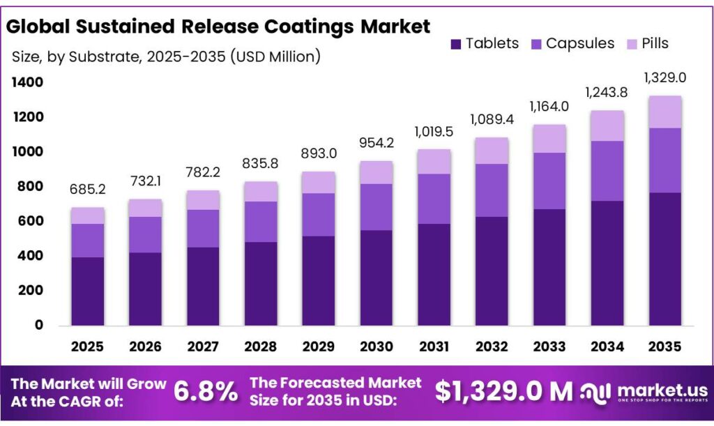 - Sustained Release Coatings Market size is expected to be worth around USD 1,329.0 Million by 2035, from USD 685.2 Million in 2025, growing at a CAGR of 6.8%.
