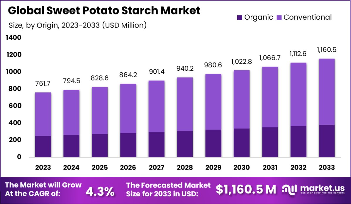 - The Global Sweet Potato Starch Market is expected to be worth around USD 1,160.5 Million by 2033, up from USD 761.7 Million in 2023, and grow at a CAGR of 4.3% from 2024 to 2033.