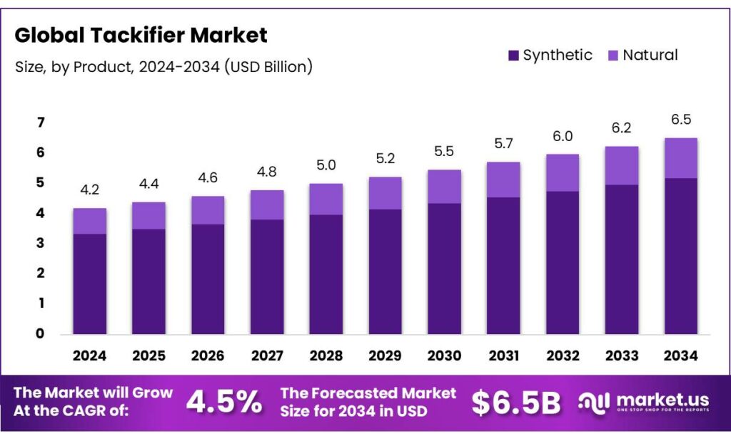 - Tackifier Market size is expected to be worth around USD 6.5 Billion by 2034, from USD 4.2 Billion in 2024, growing at a CAGR of 4.5%.