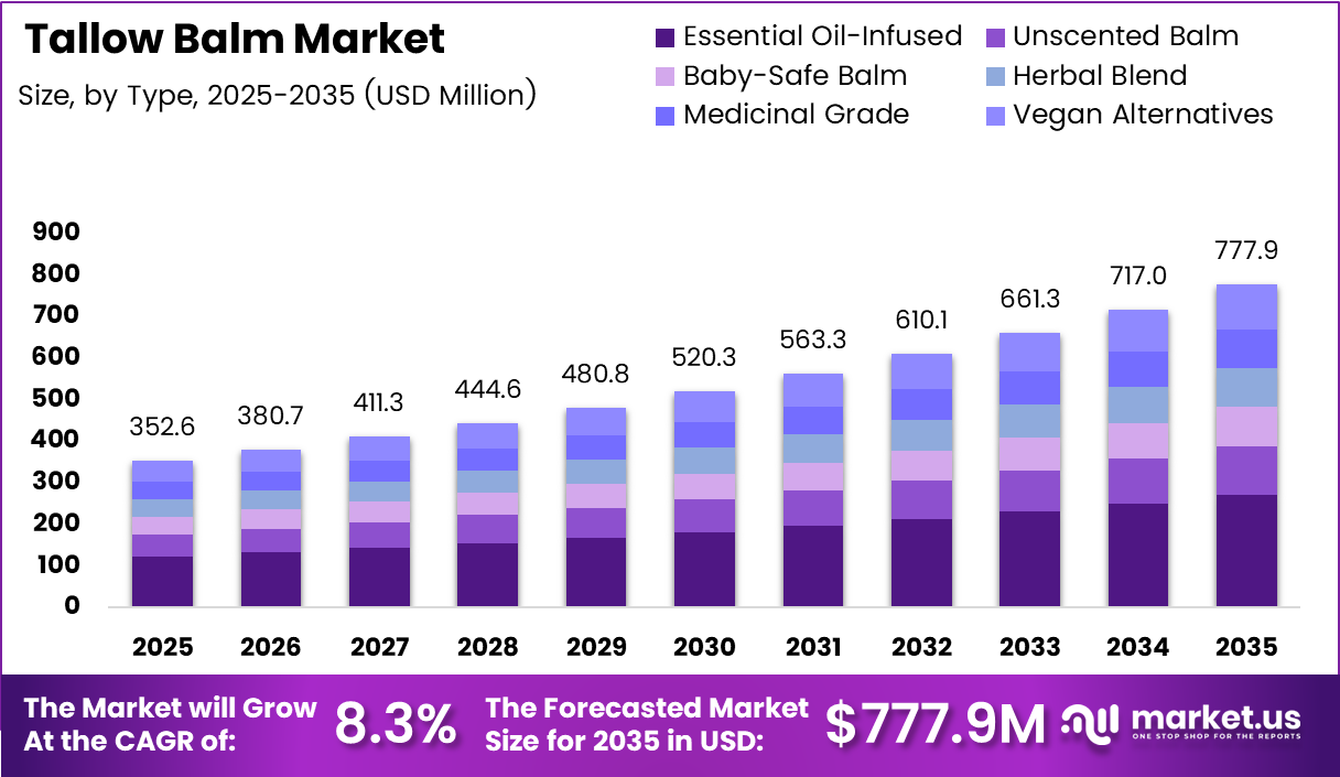 Global Tallow Balm Market size is expected to be worth around USD 777.9 Million by 2035 from USD 352.6 Million in 2025, growing at a CAGR of 8.3% during the forecast period 2026 to 2035.