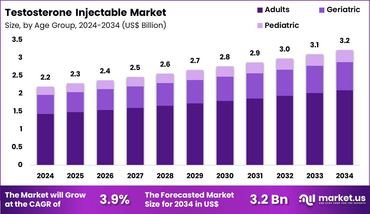 Injectable testosterone offers predictable absorption and stable serum levels. Adults prefer injectable formulations for long-acting therapeutic effects. Workplace productivity concerns support treatment initiation in working-age populations. Expansion of endocrinology and urology services improves access for adults. Adult patients often require long-term therapy, increasing cumulative consumption.