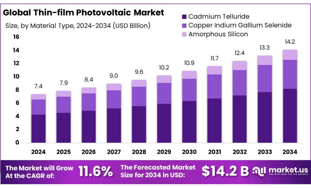 - Thin-film Photovoltaic Market size is expected to be worth around USD 14.2 Billion by 2034, from USD 7.4 Billion in 2024, growing at a CAGR of 11.6%.