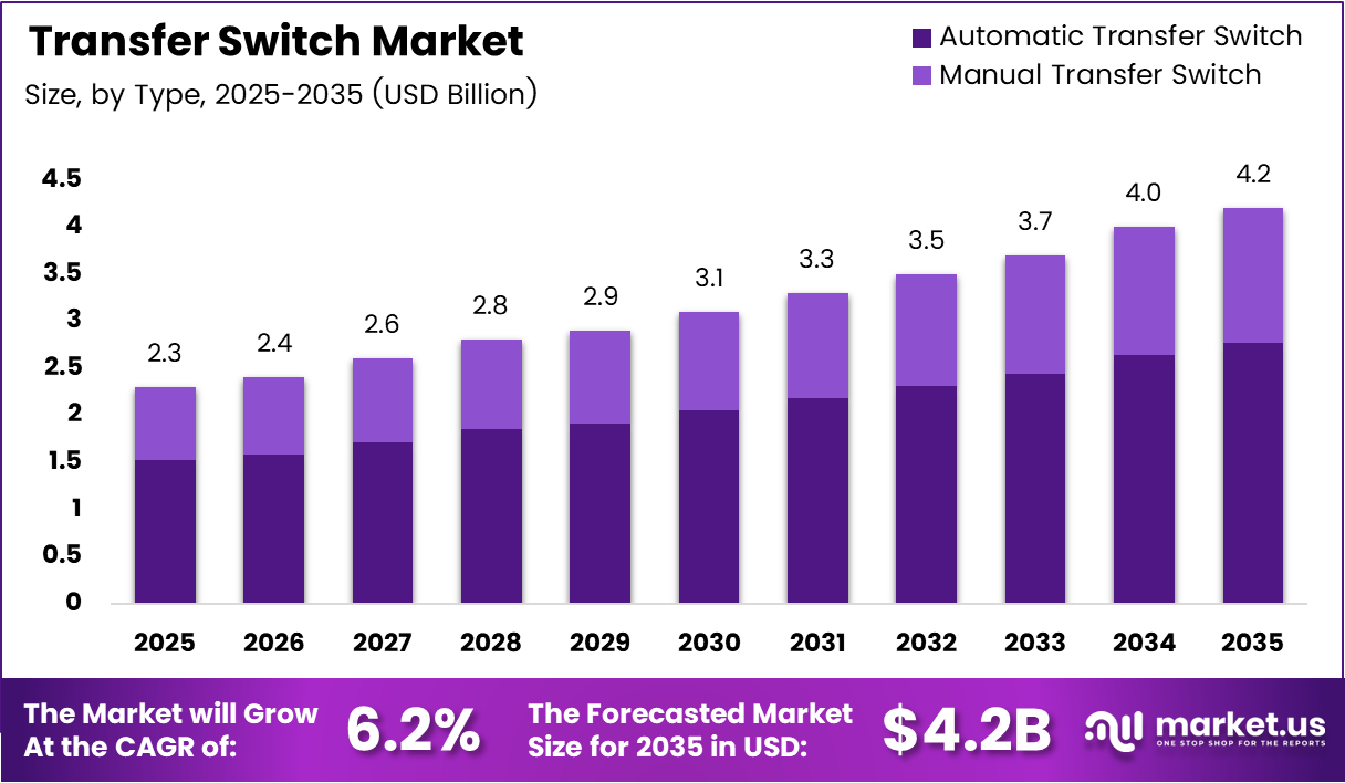 Global Transfer Switch Market size is expected to be worth around USD 4.2 Billion by 2035 from USD 2.3 Billion in 2025, growing at a CAGR of 6.2% during the forecast period 2026 to 2035.