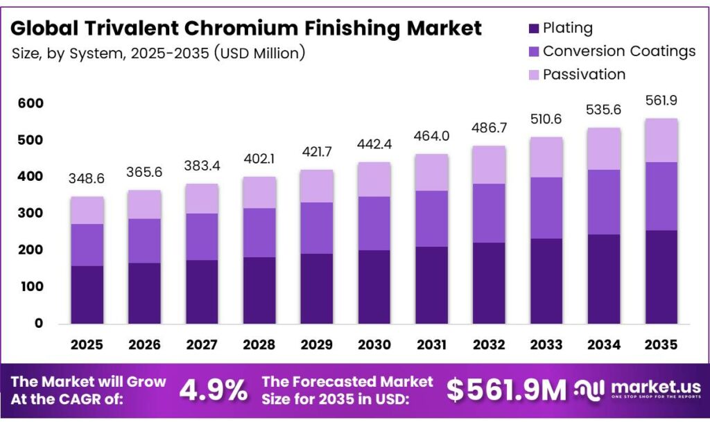 - The Global Trivalent Chromium Finishing Market is valued at USD 348.6 million in 2025 and is projected to reach USD 561.9 million by 2035 at a CAGR of 4.9% during the forecast period 2026 to 2035.