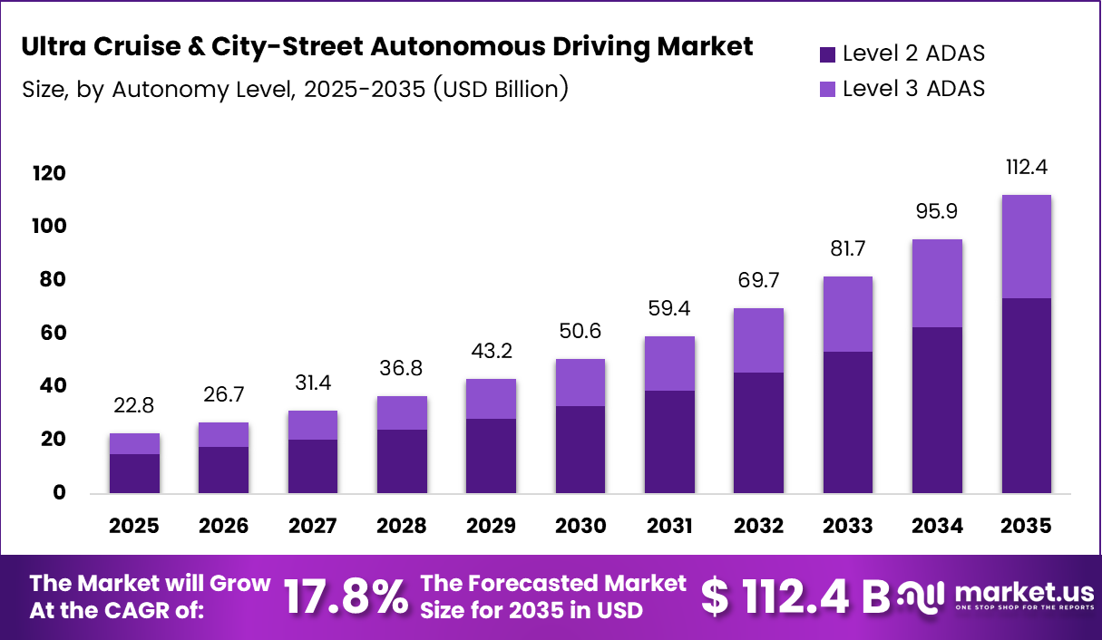 Global Ultra Cruise and City-Street Autonomous Driving Market size is expected to be worth around USD 112.4 Billion by 2035 from USD 22.8 Billion in 2025, growing at a CAGR of 17.3% during the forecast period 2026 to 2035.