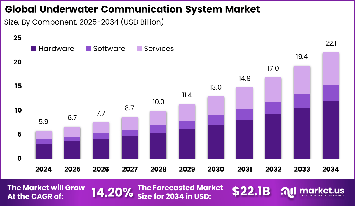 - By component, hardware accounts for approximately 54.6% of the market, driven by the demand for advanced transceivers, modems, sensors, and cabling systems that enable reliable underwater data transmission.