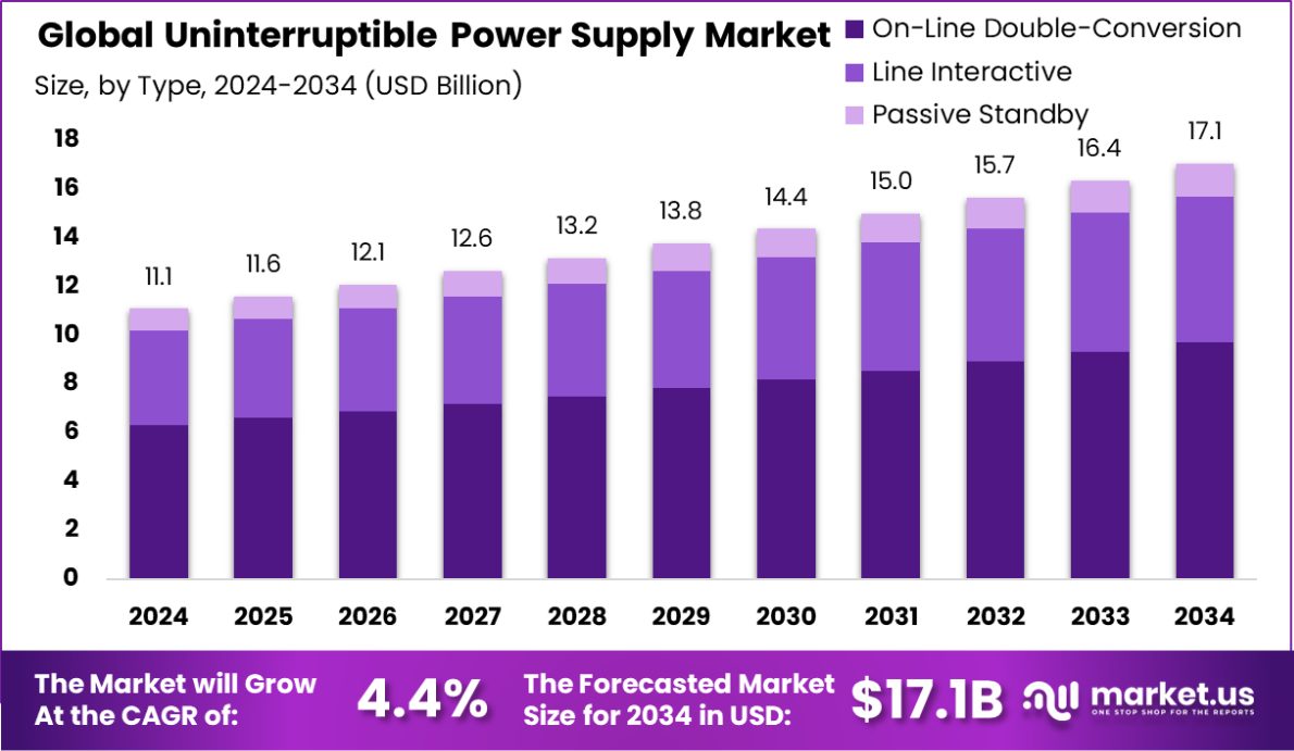 - Global Uninterruptible Power Supply Market is expected to be worth around USD 17.1 billion by 2034, up from USD 11.1 billion in 2024, and grow at a CAGR of 4.4% from 2025 to 2034.