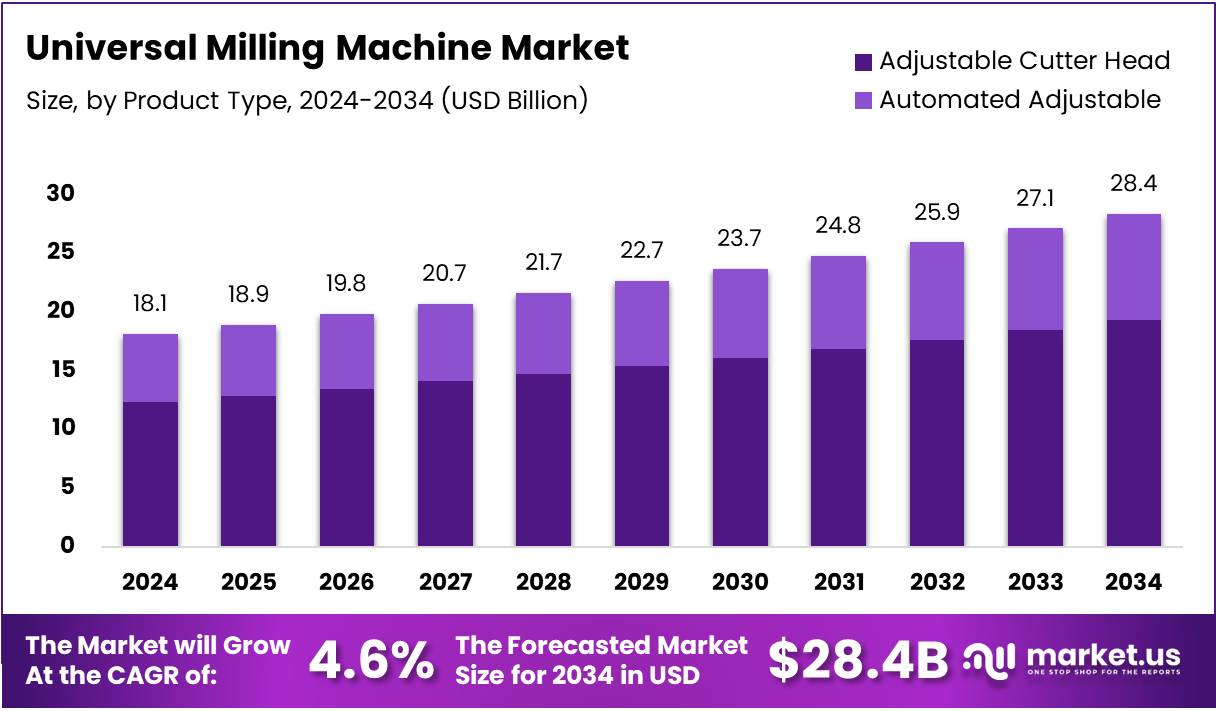 - The global Universal Milling Machine Market is projected to grow from USD 18.1 Billion in 2024 to USD 28.4 Billion by 2034, registering a 4.6% CAGR.
